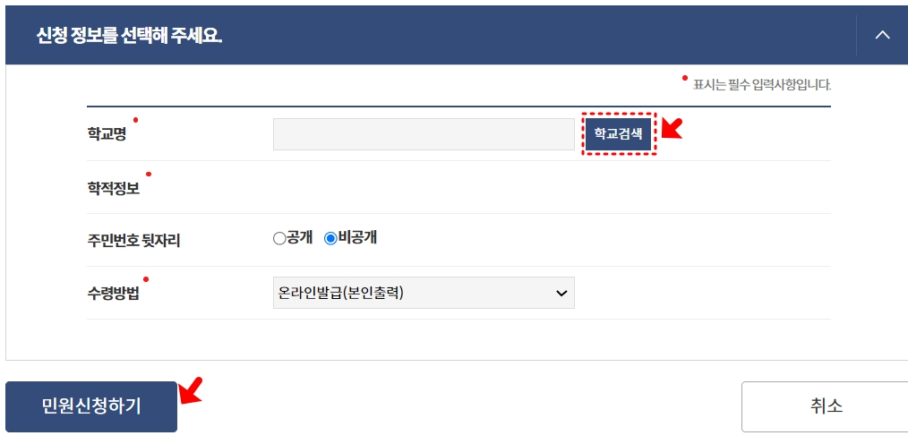 만14세 이상 민간인증와 공동인증서 중 인증 가능하다면, 정부24 회원 가입하지 않더라도 손쉽게 학생 본인이 학교생활기록부를 발급 받을 수 있습니다.