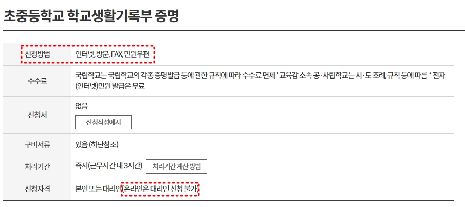 ② 생활기록부는 신청방법이 인터넷, 방문, FAX, 민원우편, 무인 발급기로 가능합니다.